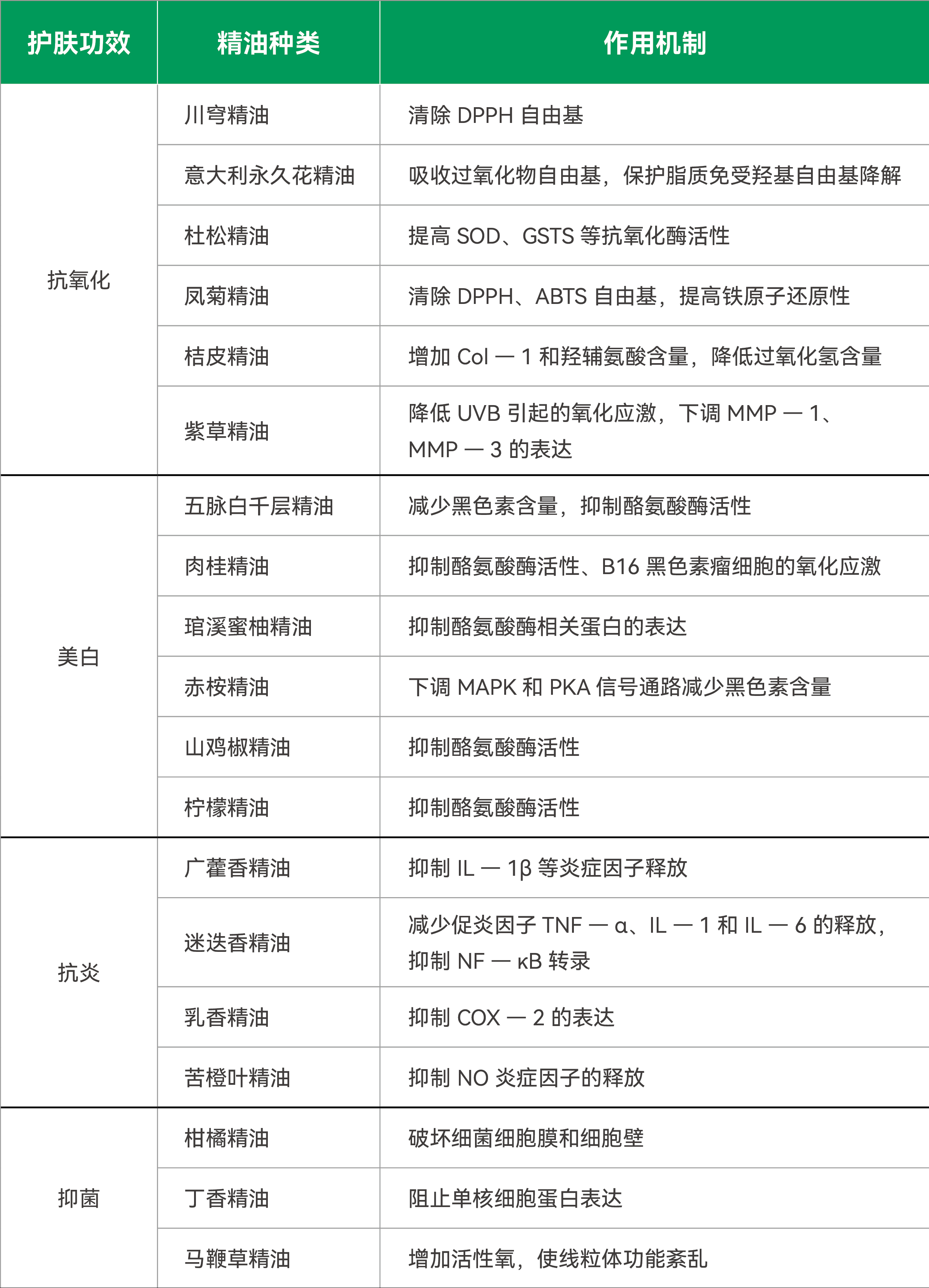 植物精油具有分子結(jié)構(gòu)小且滲透性強(qiáng)的特點(diǎn),已發(fā)現(xiàn)具有延緩衰老、美白、殺菌消炎等多種護(hù)膚功效,近些年開發(fā)成天然護(hù)膚品受到人們關(guān)注,并逐步被應(yīng)用在常見護(hù)膚體系中。國(guó)內(nèi)外專家學(xué)者對(duì)大量植物精油的生理活性和作用機(jī)理進(jìn)行研究分析和數(shù)據(jù)采集。相關(guān)研究成果如下表: