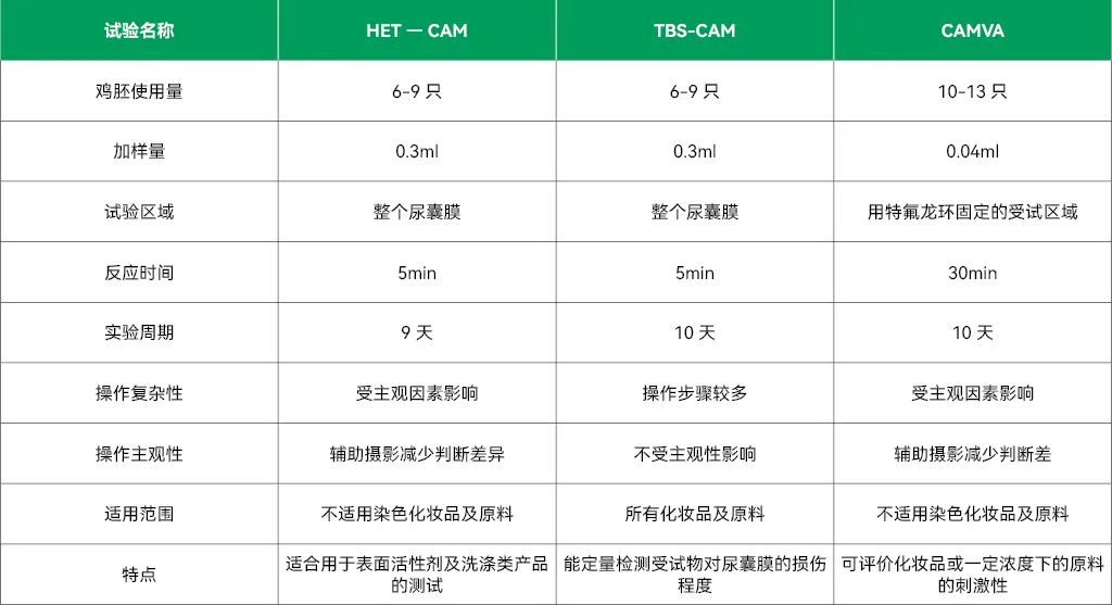 綜上所述,三種試驗各有其優(yōu)缺點(見表1),各在不同維度對刺激性進行評價,在化妝品配方及原料篩選時,可選用一種或者組合的形式對其進行評價,如HET-CAM與TBS-CAM試驗的結(jié)合,可從血管效應(yīng)產(chǎn)生的快慢以及對實驗損傷程度的量化兩個維度對受試物進行評價,也結(jié)合了主觀與客觀的評價,減少誤差。